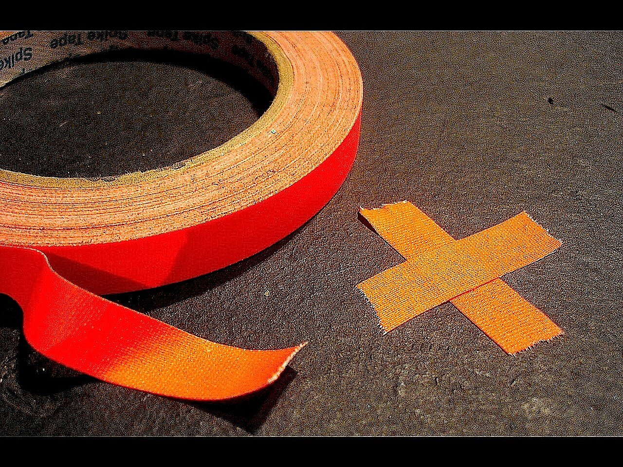 The term “spiking” originates from theatre practice, where stage managers would use small markers to indicate where set pieces or actors should stand. In modern productions, the practice typically involves using gaffer tape rather than literal spikes. Gaffer tape is preferred because it adheres well to stage surfaces, removes cleanly, and comes in various bright colours that are easy to see under stage lighting. Fluorescent colours such as pink, orange, or green are common, especially on dark stages.